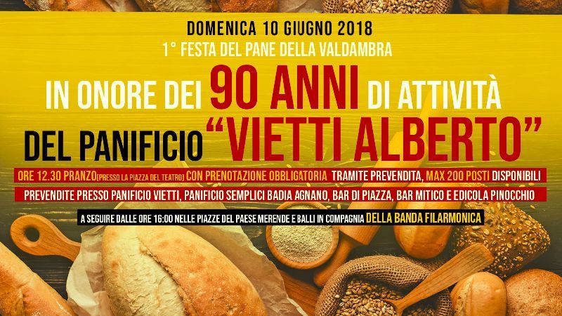 Domenica 10 giugno si terrà ad Ambra nel Comune di Bucine (AR) la “1° Festa del Pane” organizzata dalla Proloco di Ambra anche per celebrare il 90° Anniversario del “Panificio Vietti Alberto”.