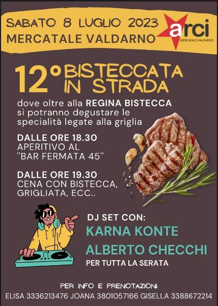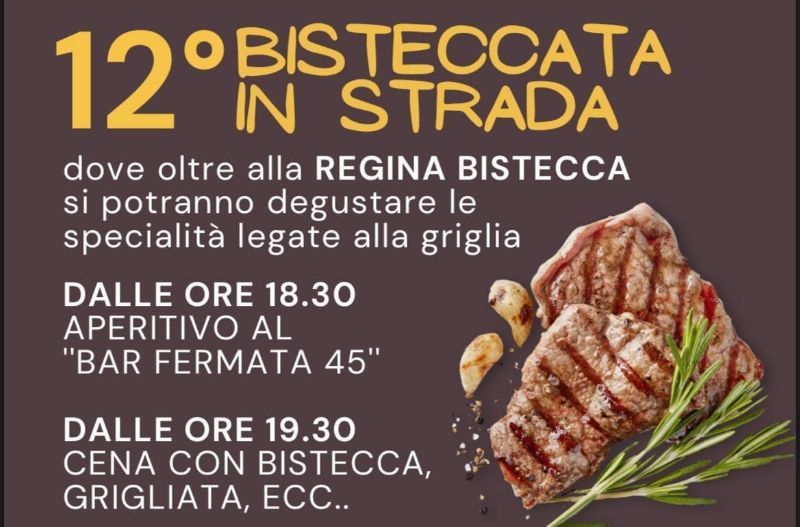 Stasera a Mercatale Valdarno, si cena e si fa notte con la 12° Bisteccata in strada, a partire dalle ore 18.30, aperitivo al Bar Fermata 45, per poi passare alle 19.30 alla cena con bistecca e grigliata.
