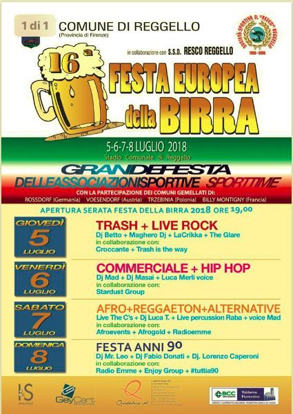 Nel week-end del 5-8 Luglio, presso lo Stadio Comunale di Reggello, torna la “ Festa Europea della Birra” che propone, come da tradizione, anche nella sua 16^ edizione, tanti stand con ottima birra, con la partecipazione di alcuni produttori provenienti da diverse parti d’Europa.