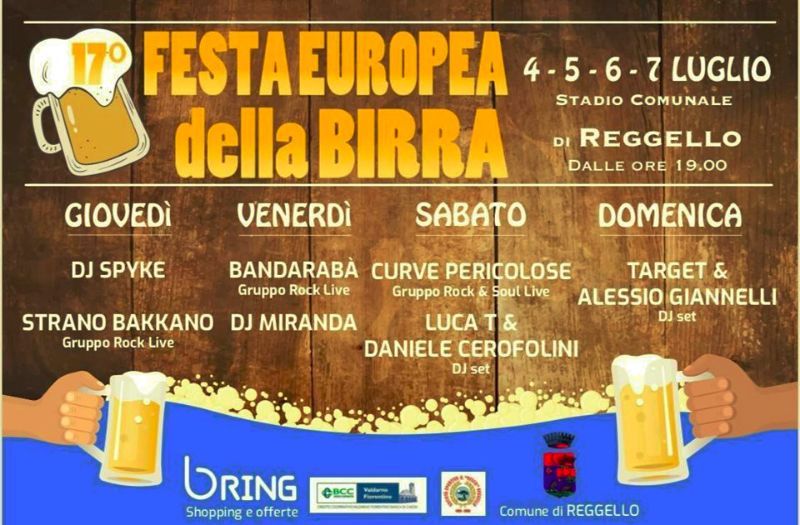 Nel week-end del 4-7 Luglio, presso lo Stadio Comunale di Reggello, torna la “ Festa Europea della Birra” che propone, come da tradizione, anche nella sua 17^ edizione, tanti stand con ottima birra, con la partecipazione di alcuni produttori provenienti da diverse parti d’Europa.