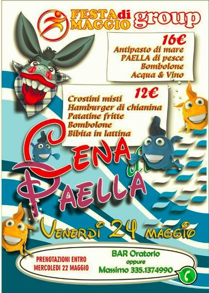 - ore 20.00: CENA RIONALE in piazza – previsti due menù: 1) Antipasto mare, Paella di pesce, bombolone, acqua e vino € 16,00; 2) Crostini misti, hamburger di chianina, patate fritte, bombolone, bibita in lattina € 12,00. Prenotazione entro Mercoledì 22 Maggio presso il Bar dell’Oratorio di Sant’Andrea oppure telefonando al numero 335.1374990 (Massimo);