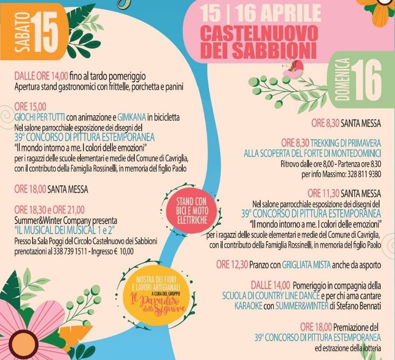Fine settimana del 15 e 16 Aprile, a Castelnuovo dei Sabbioni. Cavriglia, torna la festa di primavera, con tante attrazioni, tra cui Mostra dei fiori e lavori artigianali, stand e-bike, bici e moto,