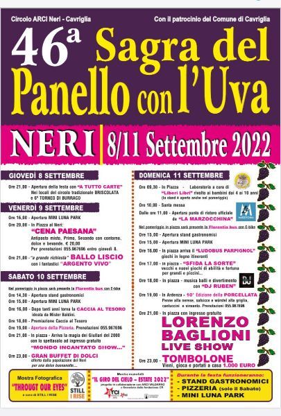 Settembre mese di vendemmie e panello con l'uva; al Neri di Cavriglia dall'8 di settembre fino a domenica 11, si potrà degustare il tipico panello festeggiando la nuova Vendemmia.