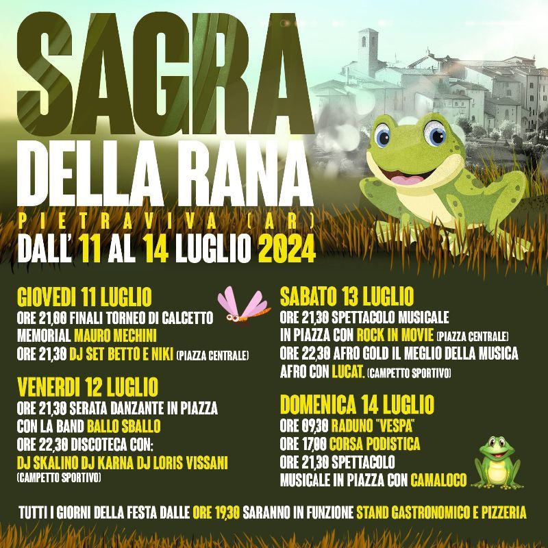 Dall’11 al 14 luglio 2024, il suggestivo borgo di Pietraviva vi accoglie per la Sagra della Rana; un evento che rinnova ogni estate l’allegria e il piacere di stare insieme in una atmosfera unica.
