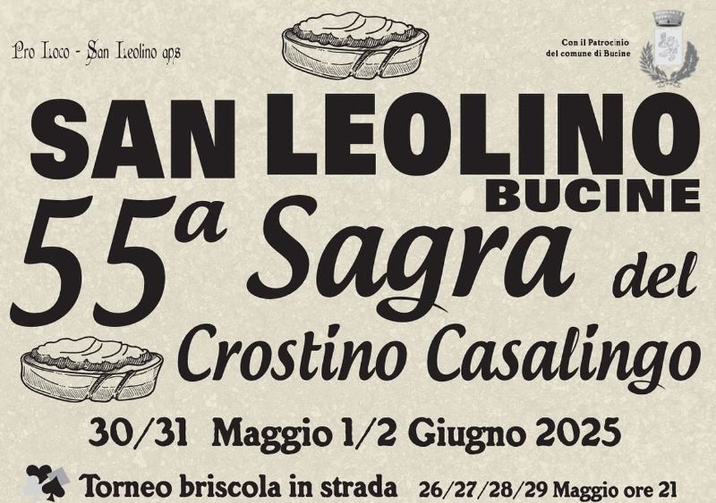 La Sagra del Crostino Casalingo torna a San Leolino di Bucine, per la sua 55ª edizione, con quattro serate imperdibili tra cucina tipica toscana, musica, risate e molto altro; non mancherò il tradizionale Torneo briscola in strada 26/27/28/29 Maggio ore 21; il torneo di calcio, vesparaduno, traking e sabato sera ti aspetta la finale di Champions League su grande schermo sotto le stelle!