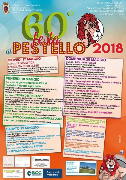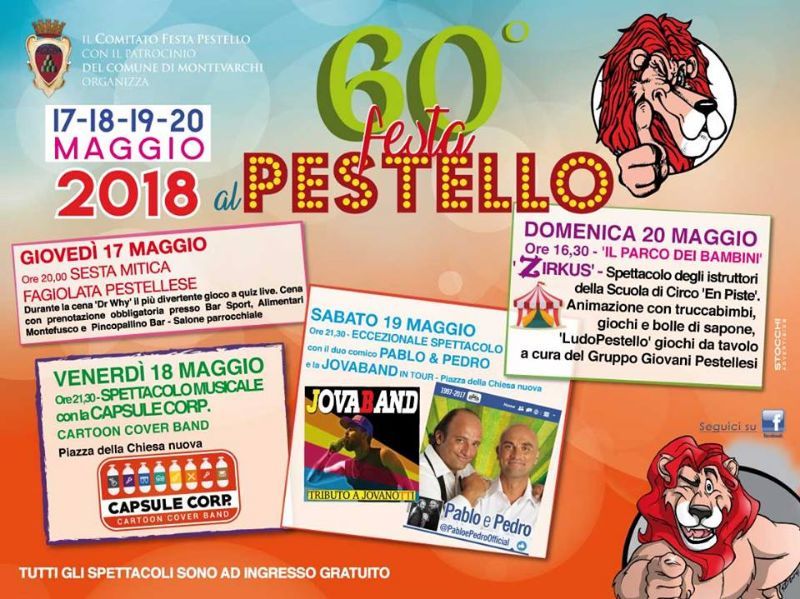 Da giovedì 17 a domenica 20 Maggio si terrà la 60° Festa del Pestello. La manifestazione, che ha avuto inizio nel 1959, è uno dei più antichi ed attesi appuntamenti del Valdarno, graditissimo sia ai grandi che ai piccini. In questo ricco week-end si potrà assistere a spettacoli di vario tipo, partecipare ad eventi sportivi e ovviamente gustare, presso numerosi stand gastronomici, un'ottima cucina toscana. Molte, dunque, le ragioni per una visita al Pestello questo fine settimana del quale vi anticipiamo, di seguito, il programma: