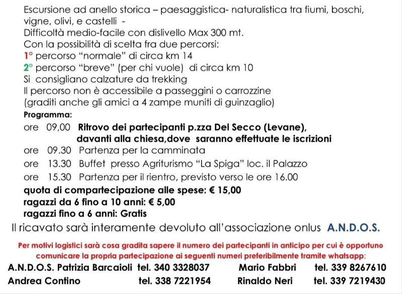 La camminata sarà organizzata con la collaborazione della Sez.Soci CoopFi di Montevarchi, della Cooperativa di Levane e di A.N.D.O.S Valdarno.