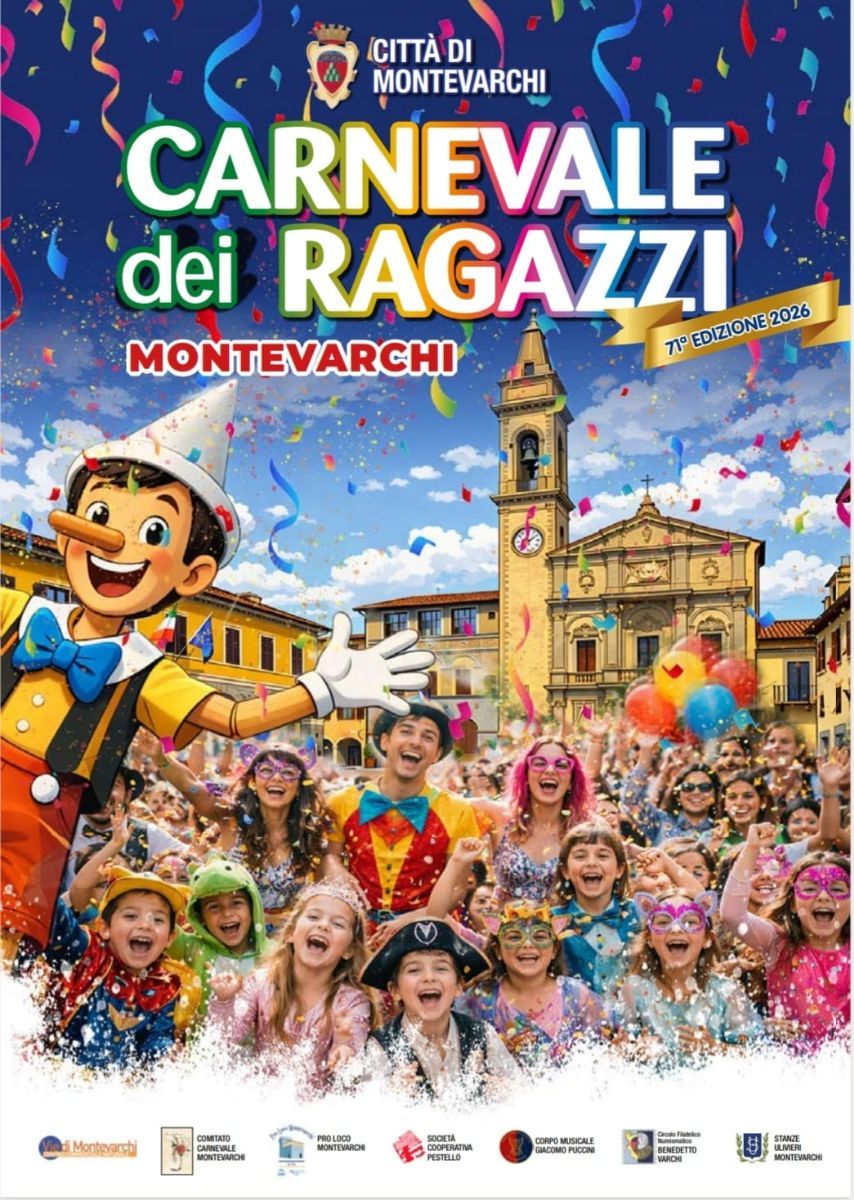 Domenica 8 Febbraio il via al 71° Carnevale dei Ragazzi di Montevarchi, evento che non si chiuderà come da tradizione il Martedì grasso 17 Febbraio ma si protrarrà nei giorni 7 e 8 Marzo presso le Stanze Ulivieri con le oramai storiche iniziative del IL PINOCCHIO D'’ORO 2026 LA MIGLIOR VOCE 21° EDIZIONE e LA PENTOLACCIA DEI BAMBINI