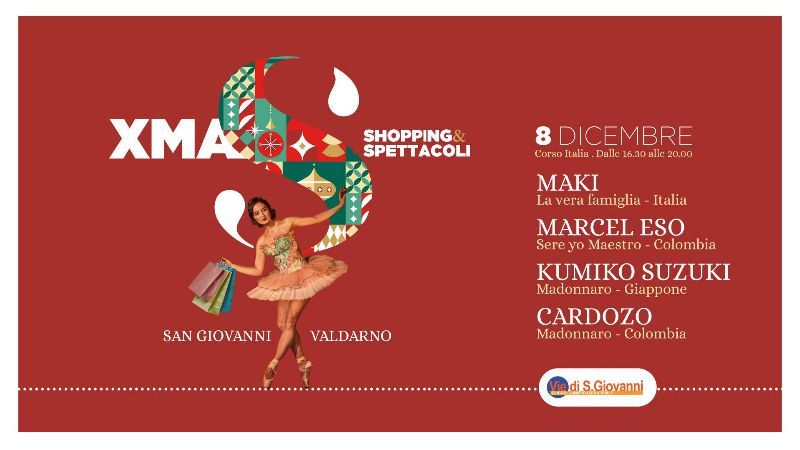 Con l'inizio delle festività natalizie parte il nostro speciale XMAShopping & Show a San Giovanni Valdarno, Giovedì 8 dicembre dalle 16.30 lungo le strade dello shopping troverete artisti Madonnari internazionali e  spettacoli che vi guideranno all’interno di un viaggio, dove l’allegria e la spensieratezza la fanno da padrone.