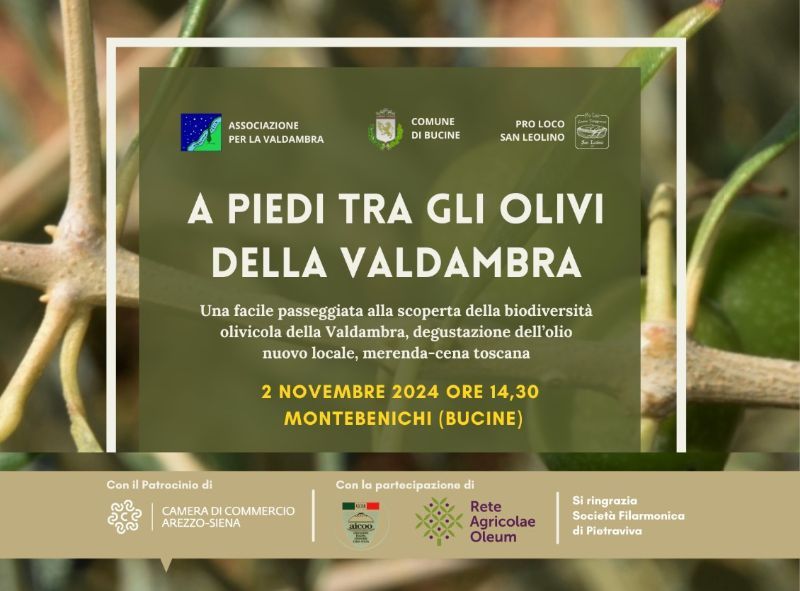 Pronti per una giornata alla scoperta della biodiversità olivicola della Valdambra? Nell’ambito delle iniziative della Festa dell’Olio EVO della Valdambra, vi invitiamo a partecipare a una speciale camminata fra gli olivi , accompagnati dall’esperto ricercatore Graziano Sani del CNR-IBE di Firenze!