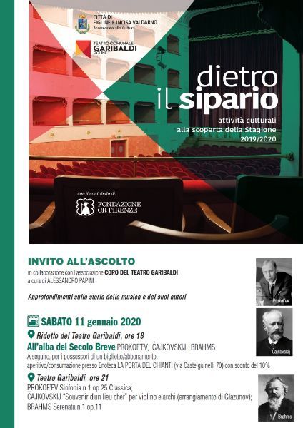 Sabato 11 Gennaio alle ore 18.00, si terrà l’Invito all’Ascolto su “All’alba del Secolo Breve”, che tratterà di Prokf’ev, Čajkovskij e Brahams. La lezione sarà tenuta da Alessandro Papini, Direttore del Coro del Teatro Garibaldi, e precederà il concerto previsto alle ore 21.00 dello stesso giorno, dove ad esibirsi sarà l’Orchestra della Toscana, in: