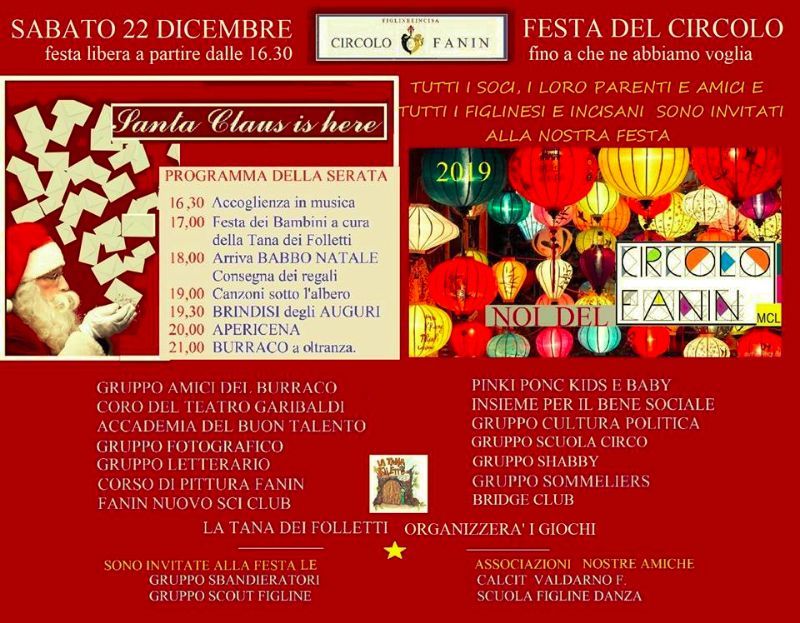- dalle 16.00, presso il Circolo Fanin di Figline Valdarno: “Santa Claus is here”, attività e animazioni per tutte le età, con musica, apericena, burraco e brindisi di auguri, in compagnia di tutti i gruppi e le associazioni che collaborano con il circolo;
