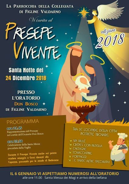 - alle ore 21.45, presso l’Oratorio Don Bosco a Figline Valdarno: la “Piccola Betlemme”, con 50 figuranti in costume pronti a rappresentare la natività di Gesù e gli antichi mestieri. Durante la serata i visitatori del Presepe vivente potranno gustare bevande calde, dolcetti e castagne.