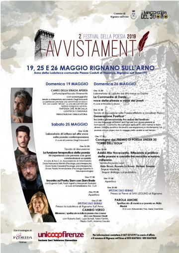 Si chiama “Avvistamenti” il 2° Festival della Poesia che sbarca a Rignano Sull’Arno, dove, Domenica 19, Sabato 25 e Domenica 26 Maggio, presso la Ludoteca Comunale, è in programma una tre giorni in compagnia di autori del territorio e artisti di livello nazionale con le loro preziose esperienze, idee e spunti di riflessione sul valore della poesia e della letteratura in genere.