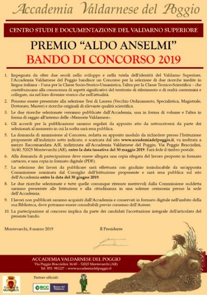 Il Centro Studi e Documentazione del Valdarno Superiore dell'Accademia Valdarnese del Poggio ha indetto il Bando di Concorso pubblico "Aldo Anselmi", per la selezione di due ricerche inedite in lingua italiana, l'una per la Classe Socio-Storico-Umanistica, l'altra per la Classe Tecnico-Scientifica, che contribuiscano alla conoscenza di aspetti significativi del territorio di riferimento o di realtà contermini e collegate.
