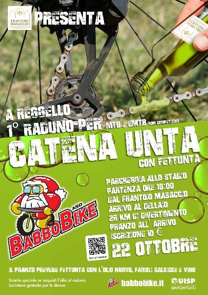Partenza dal Frantoio Masaccio alle ore 10:00, dal Frantoio 26 Km di divertimento tra gli ulivi; all'arrivo al Cellaio la Fettunta, fagioli, salsicce e vino saranno il ristoro per i partecipanti.