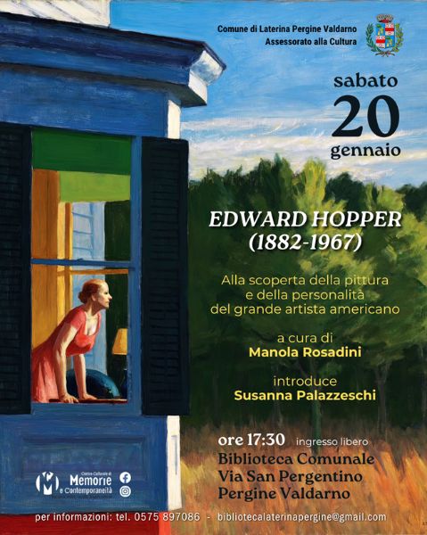 Sabato 20 Gennaio, alle ore 17.30, presso la Biblioteca di Pergine Vakdarno, si terrà la conferenza con tema: Edward Hopper (1882-1967), Alla scoperta della pittura e della personalità del grande maestro americano-