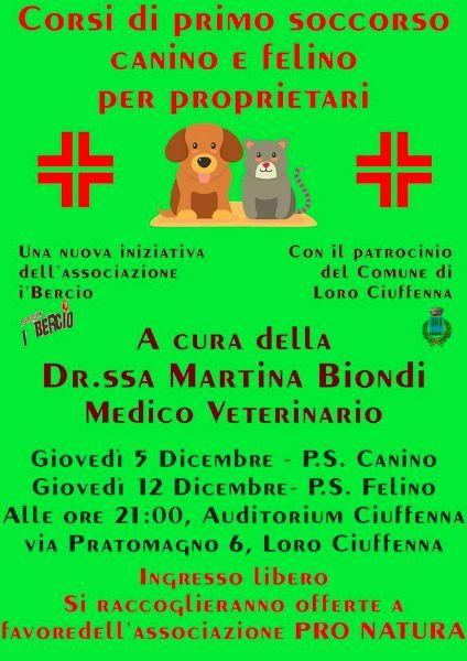 Nelle due serate di Giovedì 5 e Giovedì 12 Dicembre, alle ore 21.00, presso l’Auditorium Comunale Ciuffenna a Loro Ciuffenna, l’associazione “I’Bercio” propone due incontri con la Dottoressa Martina Biondi, medico veterinario, finalizzati ad illustrare ai presenti alcuni metodi di primo soccorso canino e felino, affinché i proprietari abbiano l’opportunità di intervenire prontamente in supporto dei propri animali domestici.