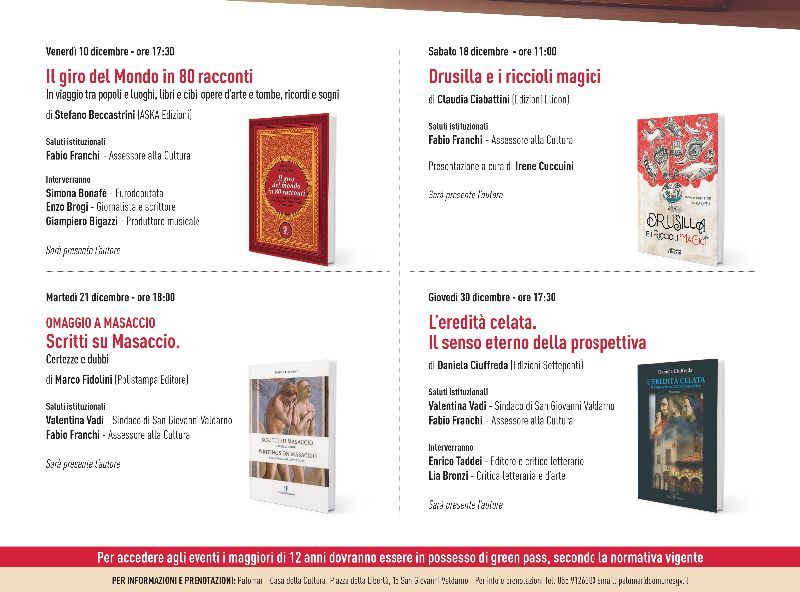 Martedì 21 dicembre sarà la giornata dedicata al più celebre dei sangiovannesi: nel giorno della sua nascita, si celebra Tommaso di Ser Giovanni di Mòne di Andreuccio Cassài, detto Masaccio, con la presentazione alle 18, sempre a Palomar, del libro di Marco Fidolini “Scritti su Masaccio. Certezze e dubbi”.