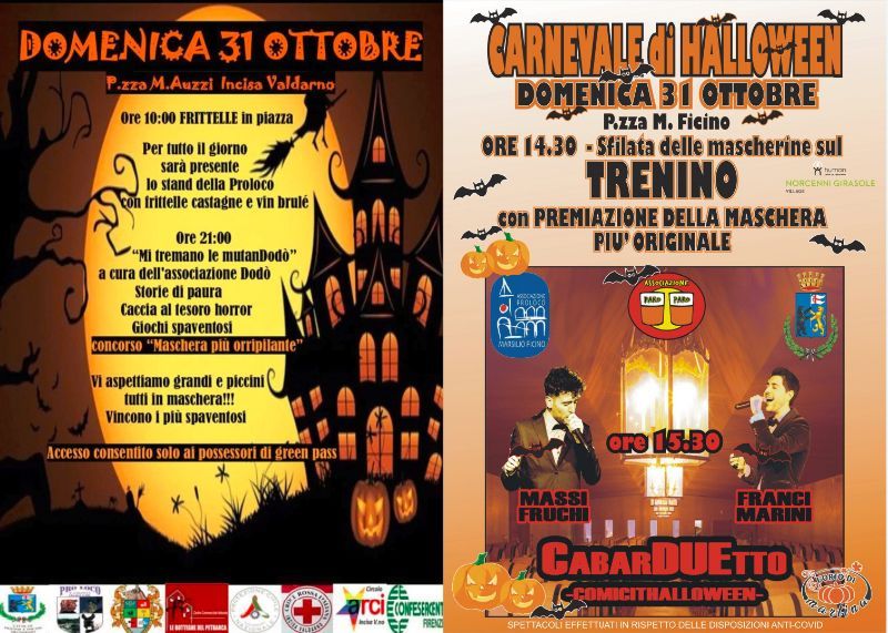 Nel giorno di Halloween, il 31 ottobre, una doppia festa, a Figline e a Incisa. A Incisa, frittelle in piazza Auzzi fin dalle 10 del mattino allo stand della Proloco Aldo Caselli che organizza l’intera giornata con il patrocinio del Comune di Figline e Incisa Valdarno. Castagne e vin brulé per tutto il giorno e, alle 21, lo spettacolo per bambini “Mi tremano le mutanDodò”, a cura dell’associazione Dodò, con storie di paura, giochi spaventosi e una caccia al tesoro horror. Grandi e piccini sono i benvenuti, meglio se in maschera. Al termine della serata, un premio per la maschera più orripilante. Ingresso libero con Green pass.