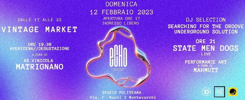 Torna al Politeama il format ECHO, pomeriggi elettronici tra Arte, Musica e Cibo, dalle 17 alle 23 Vintage Market nella galleria dello Spazio ed ancora DJ selection a cura di Searching For the Groove e Underground Solution circondati tra installazioni performative a cura a dell' Ass. MAHmutt.