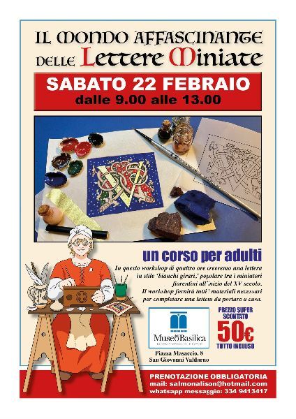 Sabato 22 febbraio Il mondo affascinante delle lettere miniate, dalle 9:00 alle 13:00, laboratorio per adulti su come creare una lettera miniata rinascimentale su pergamena, con foglia d’oro.
