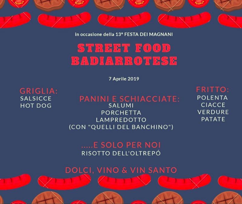 • il famoso “StreetFood Badiarrotese” a base di porchetta, lampredotto e salumi; polenta, ciacce, patate e verdure fritte; risotto dell’Oltrepò; schiacciate ripiene, salsicce e hot dog; dolci, vino e Vin Santo.