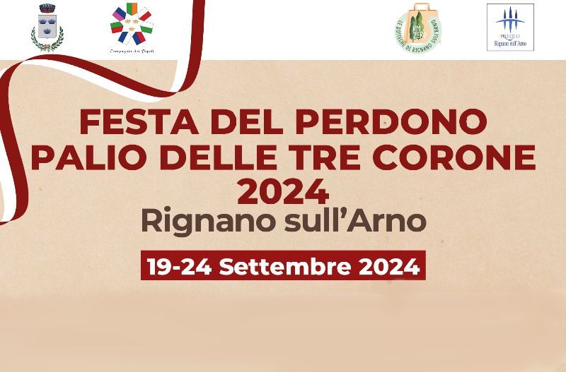 Mercoledì 19 Settembre partono a Rignano i festeggiamenti per il perdono 2024, con il palio delle Tre Corone e Rignano Run; non mancherà il tradizionale LUNA PARK dal 20 al 24 settembre presso l'area scolastica e Sportiva del Capoluogo, la FIERA DI BENEFICENZA a cura della Croce Rossa e la GARA DELLE VETRINE a cura dei commercianti con tema: IL CICLISMO.