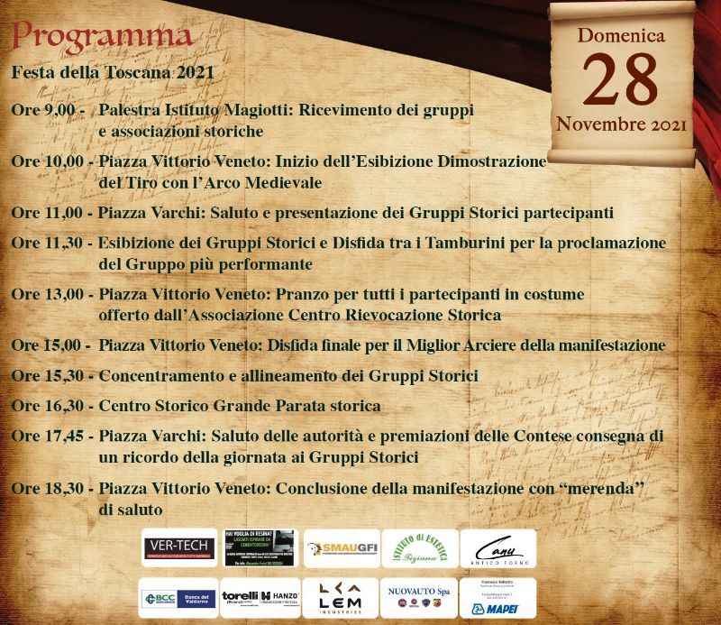 Domenica 28 Novembre per le celbrazioni della festa della Toscana, nel centro storico di Montevarchi il corteggio storico dei gruppi della provincia di Arezzo e di altri territori sara parte del programma dei festeggiamenti, con la IX parata dei gruppi storici della provincia di Arezzo.