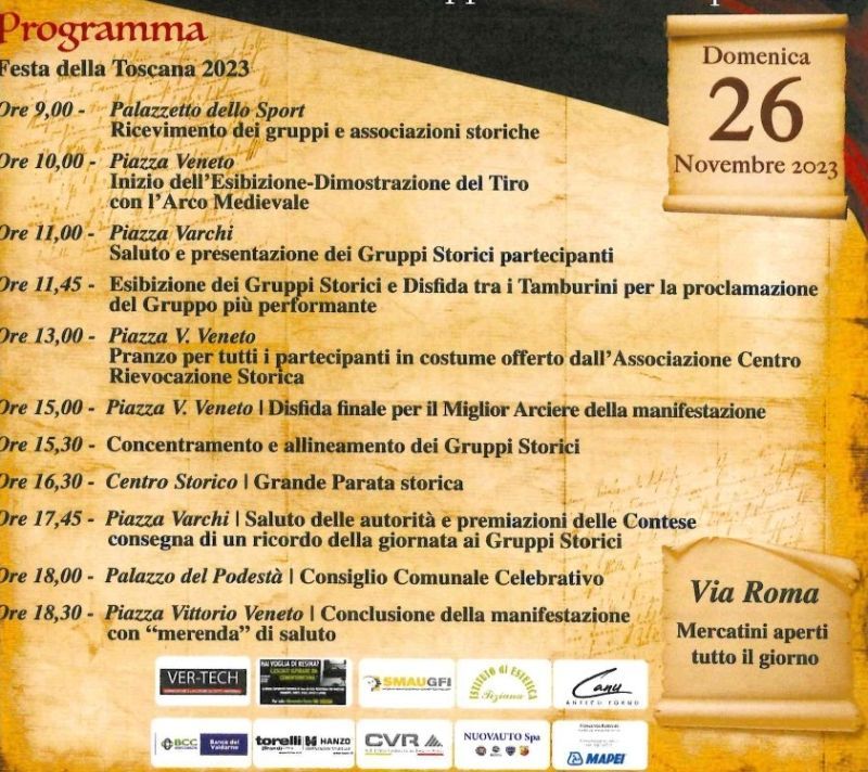 Domenica 26 Novembre a Montevarchi sarà celebrata la festa della Toscana 2023 con corteggio storico dei gruppi della provincia di Arezzo XI edizione e il Consiglio Comunale Celebrativo.