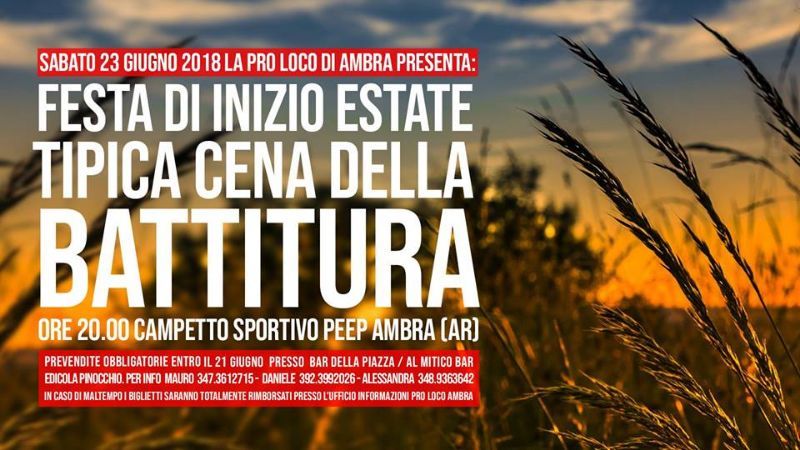 Sabato 23 giugno si terrà ad Ambra, Bucine (Ar), la tradizionale “Festa di Inizio Estate” nell'ambito della quale la rievocazione della tipica tecnica della “Battitura del Grano”, che è stata per secoli un momento di incontro e condivisione per le famiglie contadine, sarà l'occasione per rivivere le tradizioni locali e gustare piatti tipici della cucina contadina toscana.