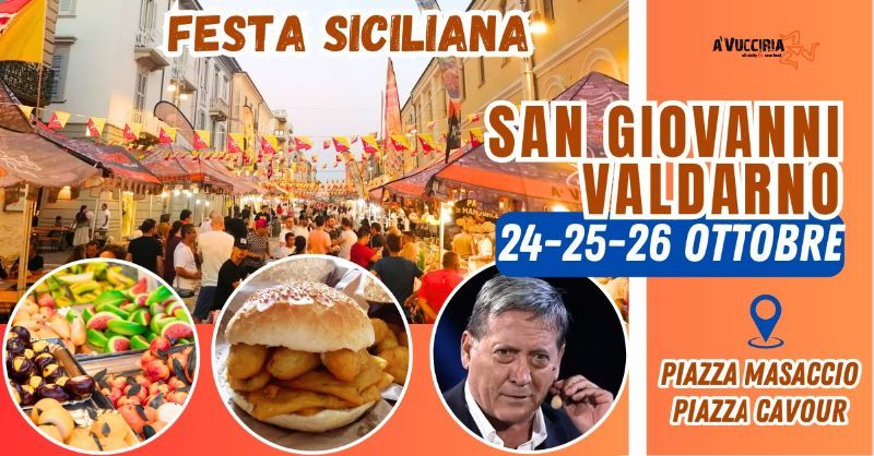 Da Venerdì 24 a Domenica 26 Ottobre, 3 giorni di Festa Siciliana, organizzata dalla Pro Loco di San Giovanni Valdarno e APS Sicilia Promotion; appuntamento in Piazza Masaccio e Piazza Cavour dalle 10:00 alle 24:00, pranzo e cena con Street Food cibi siciliani e prodotti tipici, birra artigianale e Folclore, Intrattenimento, foto e autografi con l'attore Tony Sperandeo.