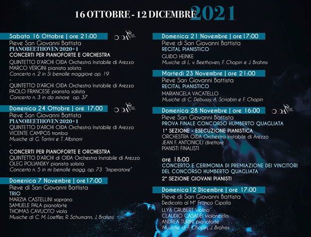 Sabato 16 ottobre alle 21 con il PianoBeethoven 2020 + 1, concerti per pianoforte e orchestra: si esibiranno il quintetto d’archi Oida, orchestra instabile di Arezzo e i pianisti solisti Marco Vergini e Paolo Francese.