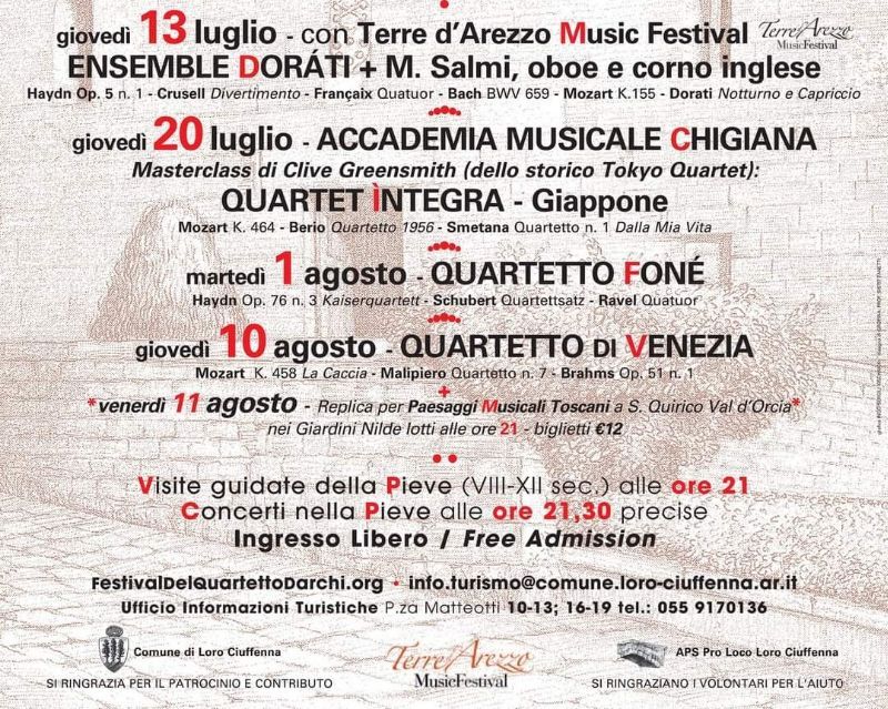 Continua il Festival Quartetto d'Archi alla Pieve di Gropina, Loro Ciuffenna, festival che ci riaccompagna all'ascolto della musica classica nella splendida cornice della Pieve di Gropina, con Ultimo appuntamento presso i giardini Nilde Iotti di San Quirico d'Orcia.