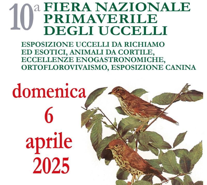 Domenica 6 Aprile a Terranuova Bracciolini Arezzo, torna la “Fiera Primaverile degli Uccelli”, manifestazione giunta alla sua decima edizione e organizzata dal Comune di Terranuova Bracciolini con la collaborazione dell’Associazione Pro Loco Terranuova APS, che ne cura l’organizzazione e la gestione, dedicata principalmente all’esposizione di uccelli da richiamo ed esotici, animali da cortile.