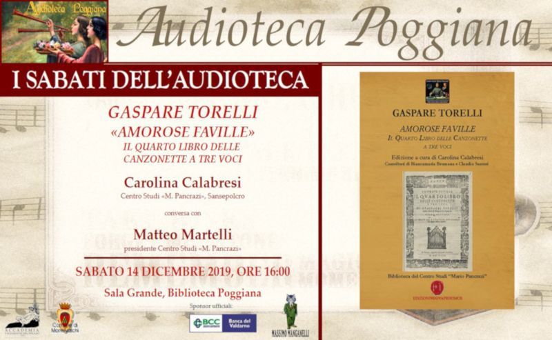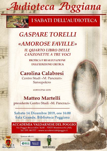 Sabato 14 Dicembre alle ore 16:00, presso la Sala Grande dell’Accademia Valdarnese del Poggio a Montevarchi (AR), si terrà il secondo appuntamento del nuovo ciclo d’incontri de “I Sabati dell’Audioteca”, dedicato a Gaspare Torelli.