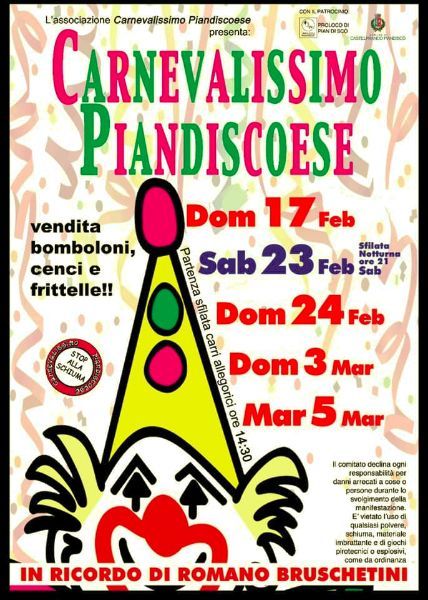 - Martedì 05 Marzo, dalle ore 14.30, a Pian di Scò (AR): “Carnevalissimo Piandiscoese”. Per informazioni: proloco.piadisco@gmail.com;