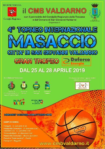 - Da Giovedì 25 a Domenica 28 Aprile a San Giovanni Valdarno (AR): “4° Torneo Internazionale di minibasket Masaccio Città di San Giovanni Valdarno”.