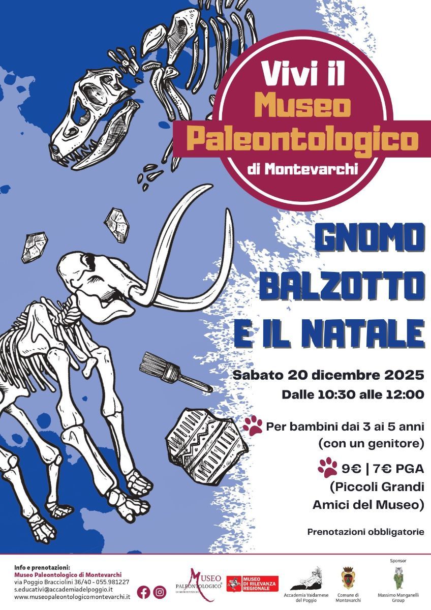 L’ultimo appuntamento dell’anno del ‘Vivi il Museo’ 2025 al Museo Paleontologico di Montevarchi porterà con sé la magia del Natale: sabato 20 dicembre, dalle 10.30 alle 12.00, Gnomo Balzotto sarà il protagonista di una mattinata speciale, ricca di meraviglia!