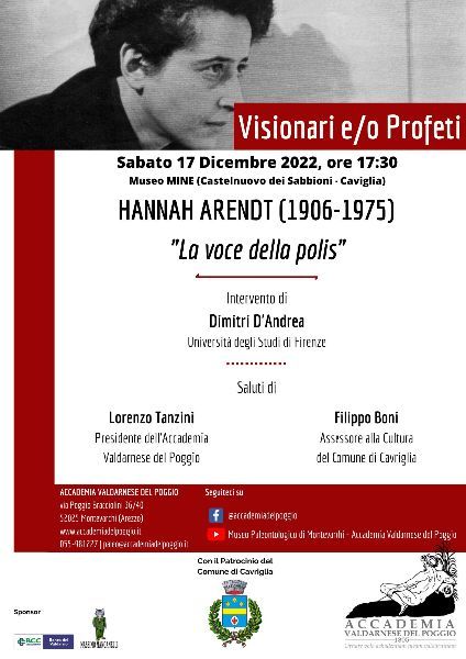 La nuova protagonista del secondo appuntamento con "Visionari e/o Profeti", promosso dall'Accademia Valdarnese del Poggio, è Hannah Arendt.