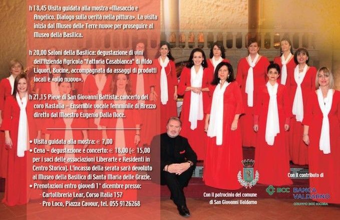 Alle 18,45 visita guidata alla mostra in corso. Alle 20,00 nei saloni della Basilica degustazione di vini e prodotti locali, alle 21,15 nella Pieve di San Giovanni Battista concerto del coro Kastalia di Arezzo. Chi ha già visitato la mostra può partecipare anche solo alla seconda parte della serata .