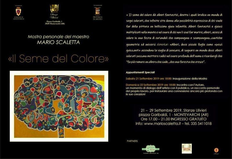 Sabato 21 Settembre, alle ore 18.00, presso le Stanze Ulivieri in Piazza Garibaldi a Montevarchi (AR), si terrà l’inaugurazione della mostra personale del Maestro Mario Scaletta, intitolata “Il Seme del Colore”, mentre Domenica 22 Settembre, alle ore 18, è previsto un incontro con l'artista.