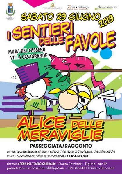 - ore 17.00, Figline Valdarno: Passeggiata/Racconto con la rappresentazione di alcuni episodi della storia “ALICE NEL PAESE DELLE MERAVIGLIE” - ritrovo in zona mura del Cassero (via Del Puglia) e Villa Casagrande per la prima delle due uscite dell’iniziativa “I SENTIERI DELLE FAVOLE” dedicata ai più piccoli.