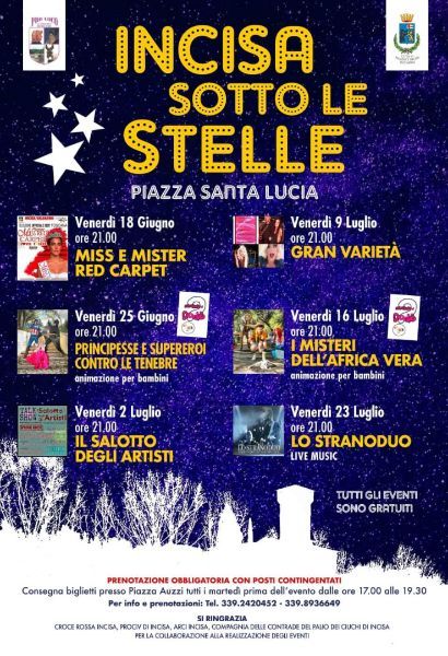 La prenotazione e la consegna dei biglietti gratuiti necessari per accedere si terranno ogni martedì prima dell’evento, dalle ore 17 alle ore 19.30 in piazza Auzzi. I posti sono limitati nel rispetto della normativa anti Covid-19. Per informazioni e prenotazioni, telefonare al 339.2420452 o al 339.8936649. Alla realizzazione degli eventi hanno collaborato Croce Rossa Incisa, Prociv di Incisa, Circolo Arci Incisa, Compagnia delle contrade del Palio dei ciuchi di Incisa.