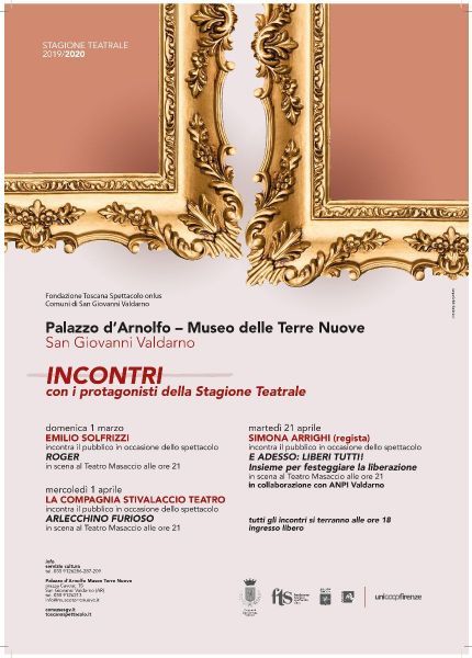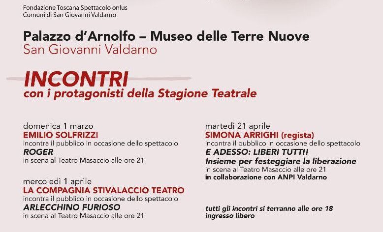 Tre appuntamenti speciali all’interno della rassegna della Stagione Teatrale di San Giovanni Valdarno, che si terranno tutti alle ore 18:00 presso Palazzo d’Arnolfo. Un’occasione unica per parlare con i protagonisti degli spettacoli, e per conoscere dettagli e curiosità dietro la messa in scena di essi. Tutti gli incontri sono gratuiti e aperti al pubblico.