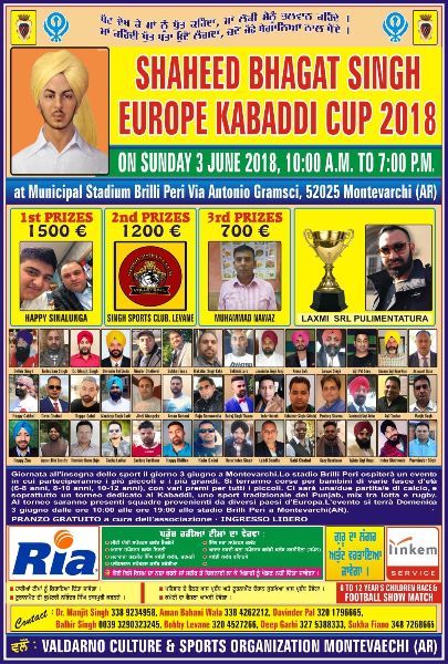 Domenica 3 giugno a Montevarchi (AR), lo Stadio Comunale “Brilli - Peri” ospiterà un’intera giornata di eventi sportivi e in particolare la “Shaheed Bhagat Singh Europe Kabbadi Cup 2018”.