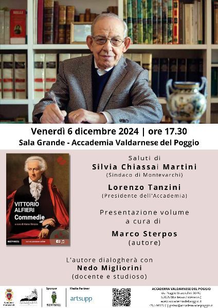 Il primo appuntamento culturale di dicembre all’Accademia Valdarnese del Poggio di Montevarchi vedrà protagonista Marco Sterpos che venerdì 6, alle 17:30 nella Sala Grande, presenterà il suo ultimo volume “Vittorio Alfieri. Commedie”.