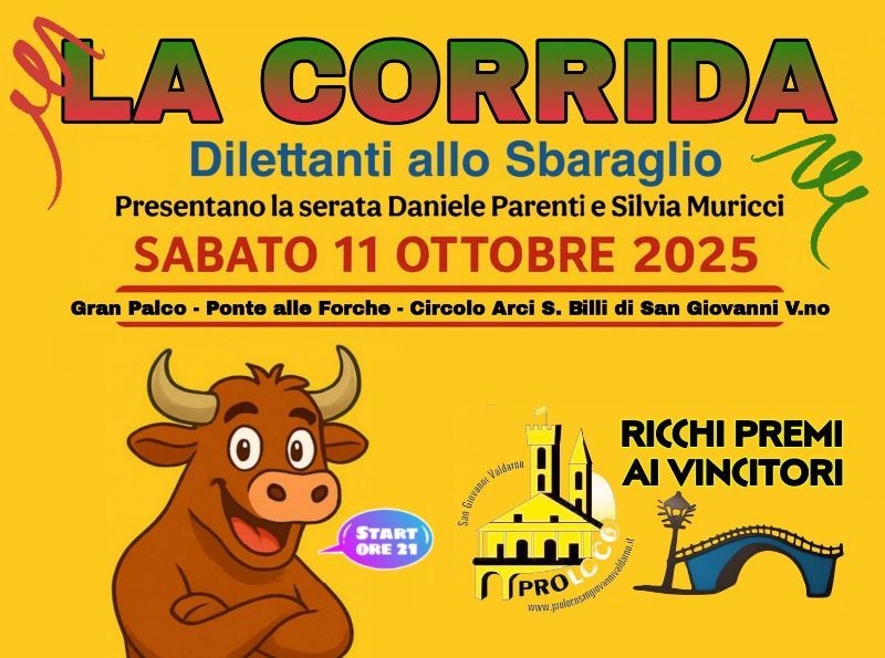 Sabato 11 Ottobre, presso il Circolo Arci "S. Billi" aps Ponte alle Forche di San Giovanni V.no, una serata dedicata ai nuovi talenti, con la Corrida, Dilettanti allo Sbaraglio.