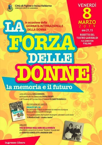 In occasione della Giornata Internazionale della Donna, presso il Ridotto del Teatro Garibaldi a Figline Valdarno, alle ore 21.15, è in programma l’iniziativa “La Forza delle Donne”, organizzata dal Comitato Unico di Garanzia del Comune di Figline e Incisa Valdarno.
