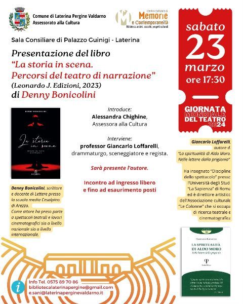 Laterina Pergine Valdarno - Il Comune di Laterina Pergine Valdarno, nell’ambito della Giornata Mondiale del Teatro 2024, ha organizzato per sabato 23 marzo a Laterina, presso la Sala Consiliare di Palazzo Guinigi, la presentazione di La storia in scena. Percorsi nel teatro di narrazione (Leonardo J. Edizioni, 2023), il primo libro dell’attore aretino Denny Bonicolini.